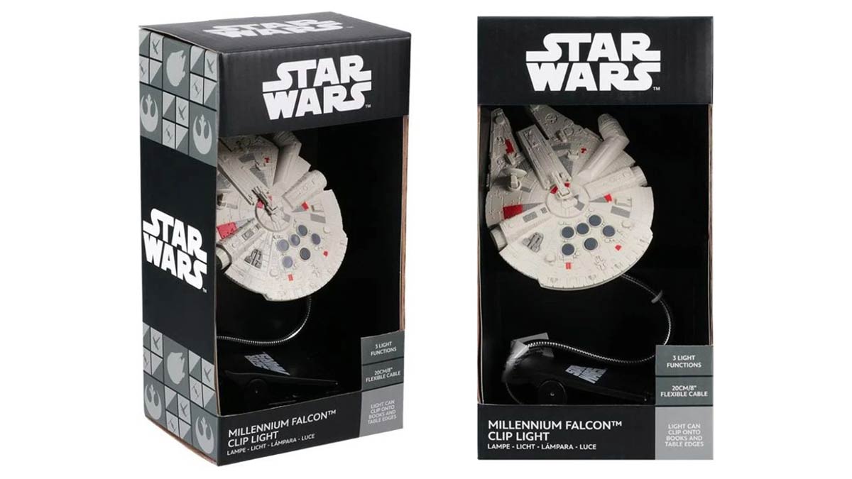 למנורה, שמעוצבת כספינת החלל של אחת הדמויות המרכזיות ביקום הבדיוני של הסדרה, האן סולו (Han Solo), בקנה מידה של 1:180, זרוע גמישה באורך של 60 ס"מ המאפשרת לכוון את האור בדיוק למקום הרצוי, הן לשם קריאת לילה כשהמנורה מוצבת על שידת הלילה והן לעבודה ממוקדת בשולחן.