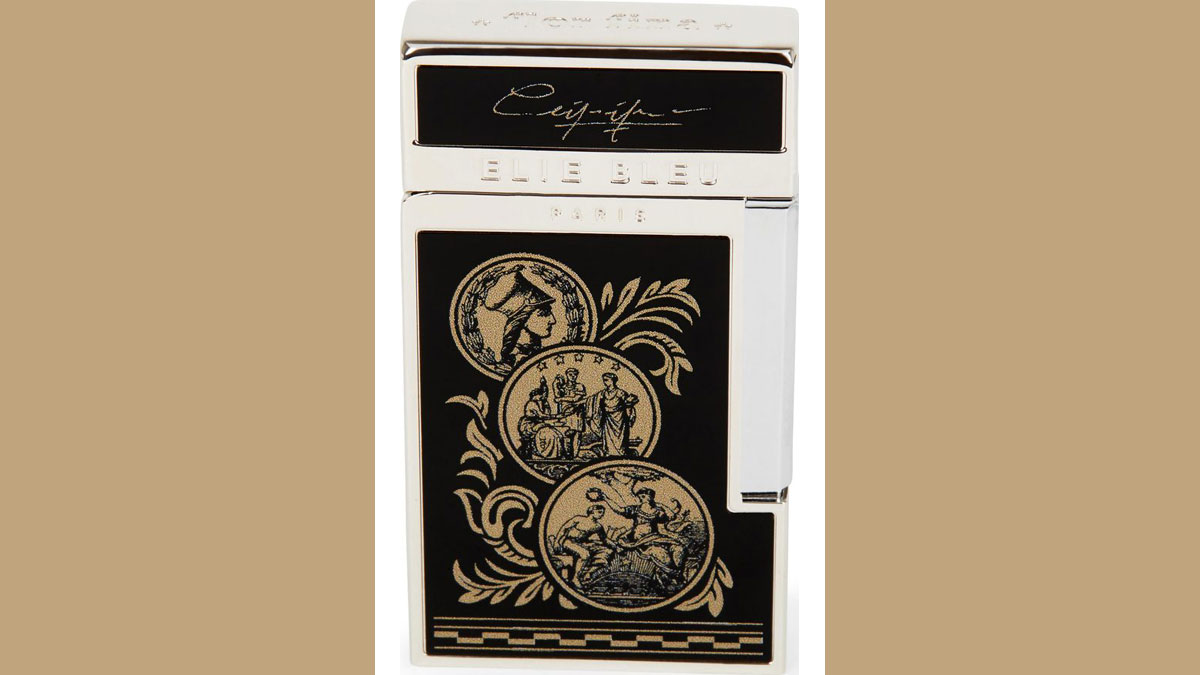 חברת מוצרי הפרימיום Elie Bleu מציגה מצית לסיגרים בעל חזית אמנותית. בעל מערכת הפעלה Piston Cap, מסנן פחמן, הצתה צידית, כיוונון להבה, חלון גז, 1.5 גרם קיבולת גז, מעטפת UV עמידה במיוחד. מידות: גובה 7 ס"מ, רוחב 3.8 ס"מ, עובי 1 ס"מ.