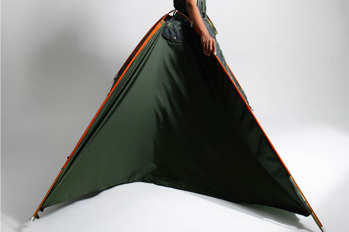 בעת הצורך אפשר לפרוס את האוהל על ידי ניתוק הפנלים, חיבורם באמצעות רוכסנים והכנסת מוטות - מה שהופך את הבגד למקלט לביש. הפתרון נועד להיות אינטואיטיבי יחסית לשימוש, אם כי בשלב הנוכחי הפריט כבד למדי בגלל מורכבות העיצוב והאלמנטים הדקורטיביים.