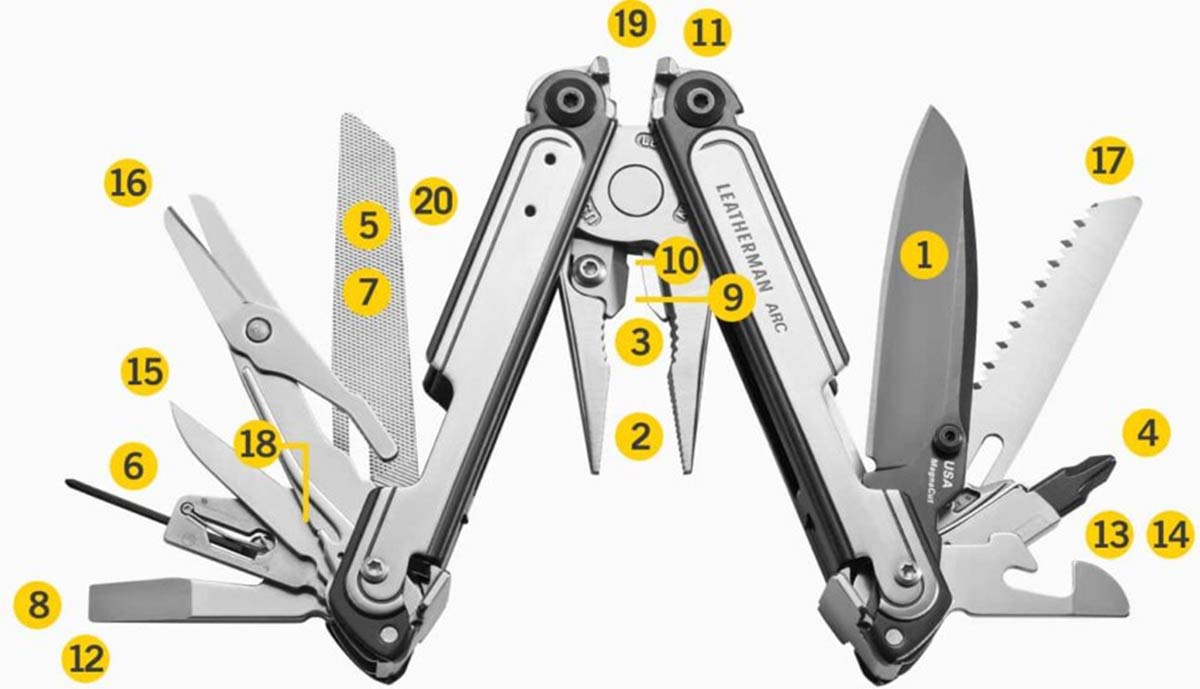 הכלי מאגד 20 פונקציות עבודה: פלאייר שפיץ, פלאייר רגיל, חותך תיל להחלפה, חותך כבל למכונות קשות, להב סכין MagnaCut, פלייר רגיל, פותחן קופסאות, פותחן שימורים, מסור, מרצע, מברג גדול, מברג קטן, מברג בינוני, מברג פיליפס, שופין עץ ומתכת, שופין יהלום, אוחז ביט גדול, אוחז ביט קטן, סרגל ומספריים קפיציות.
