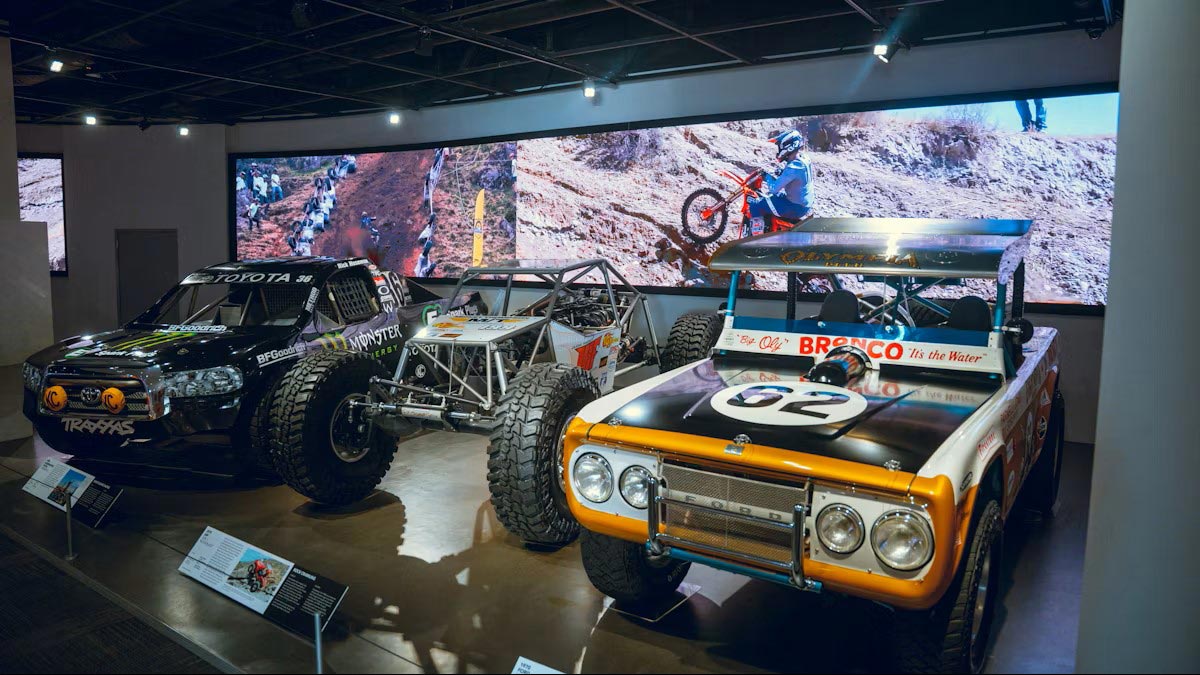 בתערוכה מוצג אוסף מרשים של אגדות מעולם הספורט המוטורי, שכל אחת מהן נהפכה לאבן דרך בתחום בזמנה. בין הדגמים הבולטים: "אולי הגדול" - פורד ברונקו (Ford Bronco) של פרנלי ג'ונס (Parnelli Jones), ששלט במרוצי באחה בתחילת שנות ה־70 והניח את היסודות למה שיתפתח מאוחר יותר לקטגוריות המודרניות.