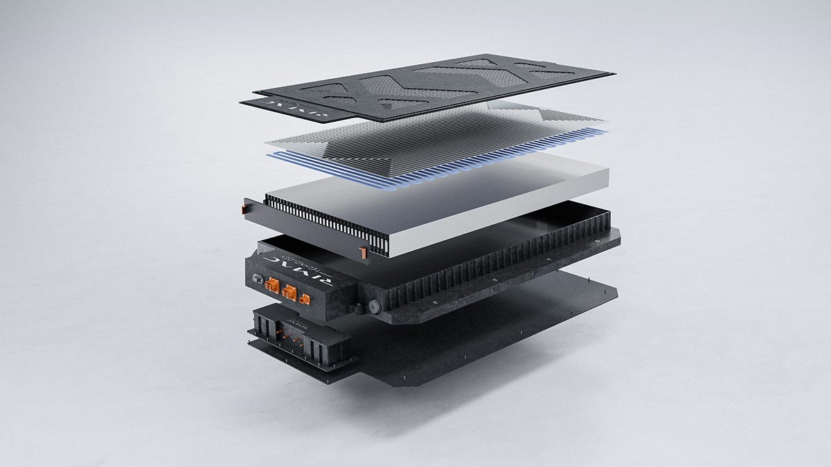 הסוללה בנויה בתצורת Cell-to-Pack עם קתודה המבוססת על ניקל־מנגן־קובלט (90:5:5) ואנודה מסיליקון טהור, במארז קומפוזיט קל משקל עם קירור עקיף באמצעות נוזל קירור. כך ממשיכה רימק עם תפיסת הליבה שלה: יעילות, משקל מופחת ובטיחות גבוהה.