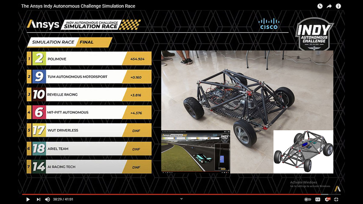בתחרות אינדי הבינלאומית של רכבי מרוץ אוטונומיים שהתקיימה לאחרונה, הגיעה הקבוצה מאוניברסיטת אריאל לשלב הגמר בשלב הסימולציה בתחרות. זהו שלב ביניים לקראת תחרות עם רכבים אמיתיים שתתקיים באוקטובר 2021 על מסלול המרוצים באינדיאנפוליס. שם יתקיים מרוץ Indy 500. לתחרות ניגשו 30 קבוצות מאוניברסיטאות מובילות בעולם כגון MIT, ברקלי, פרדו, אוניברסיטת מישיגן, המכון הטכנולוגי בשוויץ והאוניברסיטה הטכנולוגית במינכן. 16 קבוצות הגיעו לשלב הסימולציה, שבו עלתה אוניברסיטת אריאל לשלב הגמר וסיימה במקום השישי.