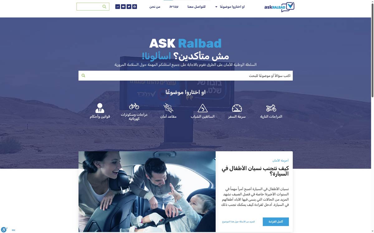 הרשות לבטיחות בדרכים השיקה לציבור הרחב את פלטפורמת ASK רלב״ד בשפה הערבית, אשר נועדה להנגיש מידע אמין ומקצועי בנושאי בטיחות בדרכים לציבור דובר הערבית ולהתמודד עם פערי ידע בתחום.