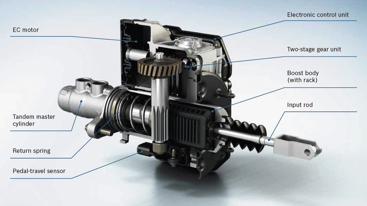 חברת בוש לדוגמה חשפה בכנס מהנדסי הרכב הבינלאומי בצפון אמריקה טכנולוגיה ושירותים לפתרונות הבלמים שלה, כולל בלימה עודפת לנהיגה אוטונומית. פריצת הדרך הטכנולוגית בבלימה עודפת הושגה על ידי שינוי אלמנט אחד במערכת: בוסטר הוואקום שמפעיל את הבלם מוחלף במאיץ חכם אלקטרו-מכני ששמו iBooster. הרכיב מאפשר להעצים את מערכת הבלימה, ובו בזמן מספק גיבוי מכני למערכת האלקטרונית. ממדיו צנועים. לא עוד בוסטר גדול ומערכת בלימה מגושמת, אלא מערכת קטנה, קלה ונגישה, שמשלבת מספר פתרונות חכמים לבלימה. בבוש מדגישים שהמערכת מתאימה לכל כלי הרכב, אך בעיקר לכלי רכב היברידים וחשמליים, שבהם מערכת הבלימה צריכה להיות מדויקת מאוד ולאפשר טעינה מחדש של מרבית אנרגיית הבלימה.