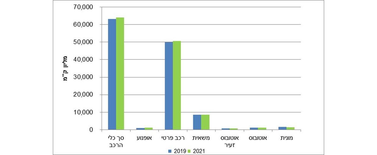 הנסועה השנתית של כלי הרכב הפרטיים עלתה ב-18.1%. הנסועה השנתית הממוצעת של כלי רכב פרטיים עלתה בשנת 2021 (כ-15.3 אלף ק"מ) ב-13.4% לעומת שנת 2020 (13.5 אלף ק"מ). היא לא חזרה לרמה שלפני הקורונה. בשנת 2019 נסע רכב פרטי 16.2 אלף ק"מ בממוצע.