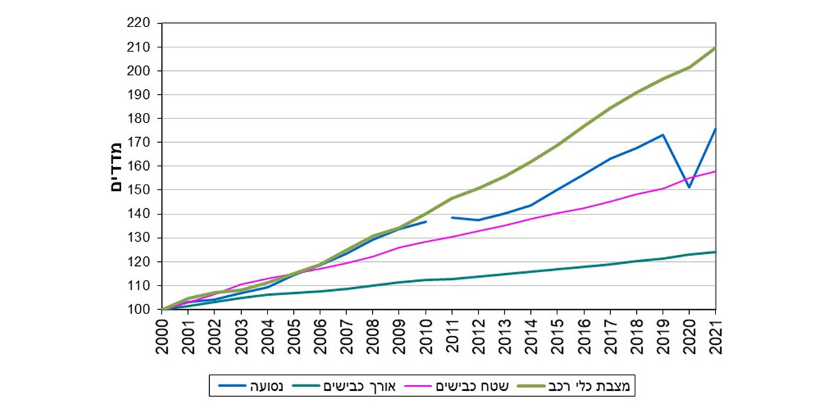 נסועה שנתית, מצבת כלי הרכב, שטח הכבישים ואורכם, 2021-2000 (בסיס: 100=2,000)