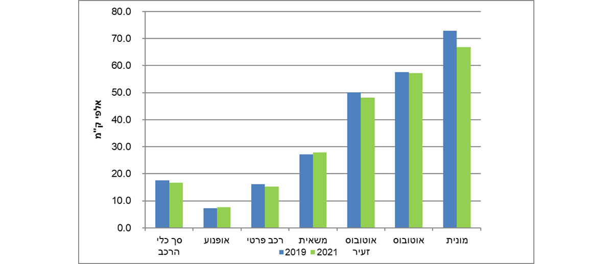 הנסועה השנתית הממוצעת של מוניות (66.8 אלף ק"מ) אומנם עלתה ב-20.1% לעומת שנת 2020, אך היא עדיין נמוכה מרמתה בשנת 2019 (72.8 אלף ק"מ). לעומת זאת הנסועה השנתית הממוצעת של אופנועים עלתה בשנת 2021 בהשוואה לשנת 2019 (7.6 אלף ק"מ לעומת 7.2 אלף ק"מ, בהתאמה).