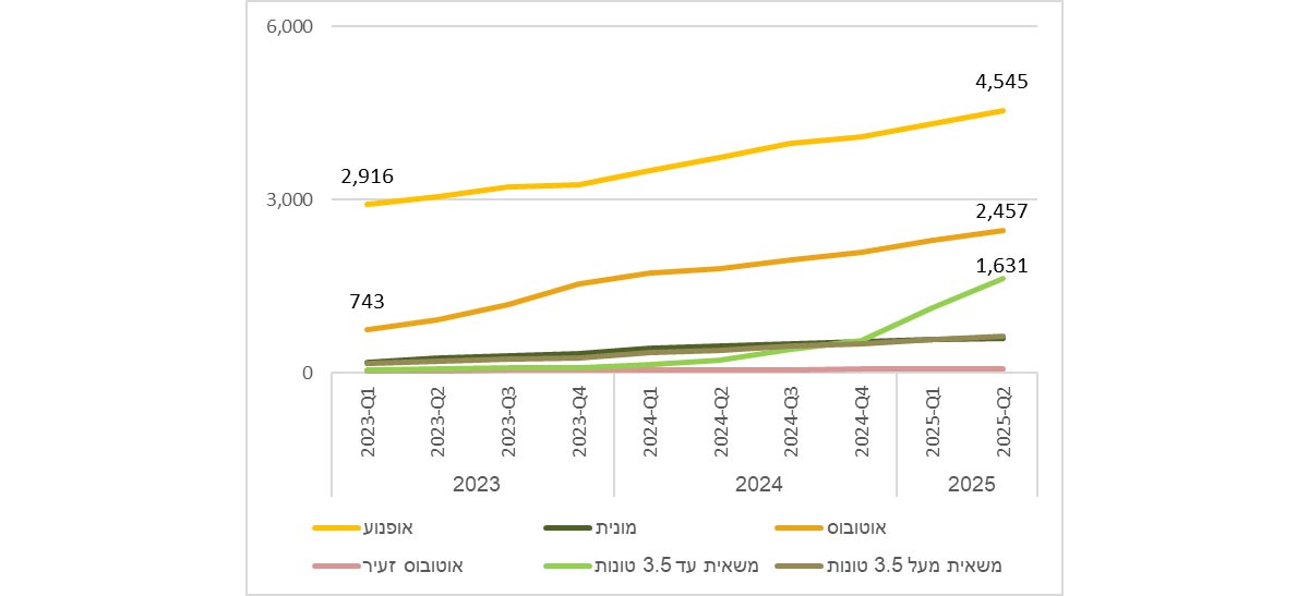 תרשים7: שאר כלי הרכב החשמליים (אופנוע, אוטובוס, מונית, אוטובוס זעיר ומשאית), 2023 עד 2025 (רבעון שני)