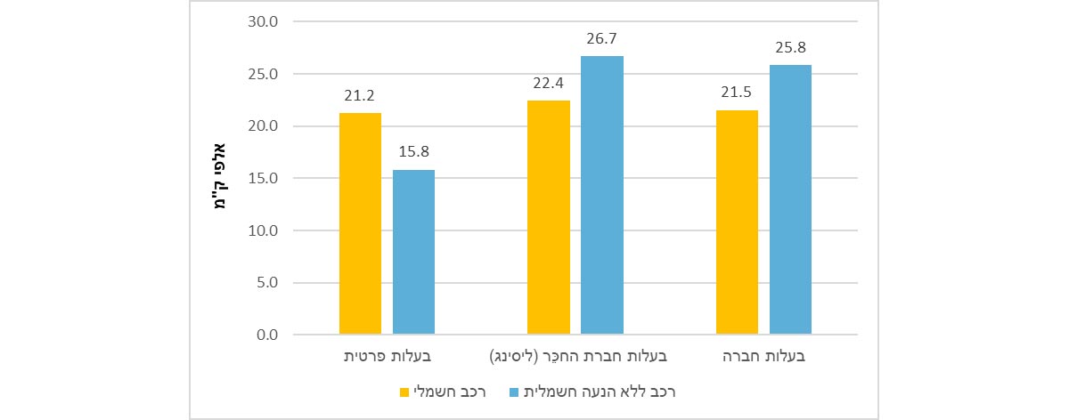 בתרשים 4 ניתן לראות שבשונה משאר סוגי הבעלות, כלי רכב פרטי חדש בבעלות פרטית המונע באמצעות חשמל נוסע בממוצע יותר ממקבילו שאינו מונע באמצעות חשמל ( 21.2 אלף ק"מ לעומת 15.8 אלף ק"מ). בתוך קבוצת כלי הרכב הפרטיים החדשים המונעים באמצעות חשמל, נמצא פער נמוך בין נסועה שנתית ממוצעת של רכב בבעלות פרטית (21.2 אלף ק"מ) לבין שאר סוגי הבעלות:24.8 חברות החכֵּר (22.4 אלף ק"מ) וחברה (21.5 אלף ק"מ).