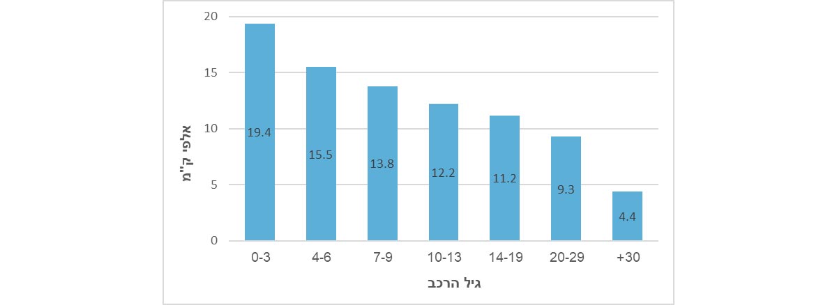 כלי רכב פרטיים חדשים המונעים בסולר נסעו בממוצע 24.5 אלף ק"מ. כלי רכב פרטיים חדשים המונעים בחשמל נסעו בממוצע 21.3 אלף ק"מ. לעומת זאת כלי רכב חדשים המונעים בבנזין נסעו בממוצע 18.6 אלף ק"מ.