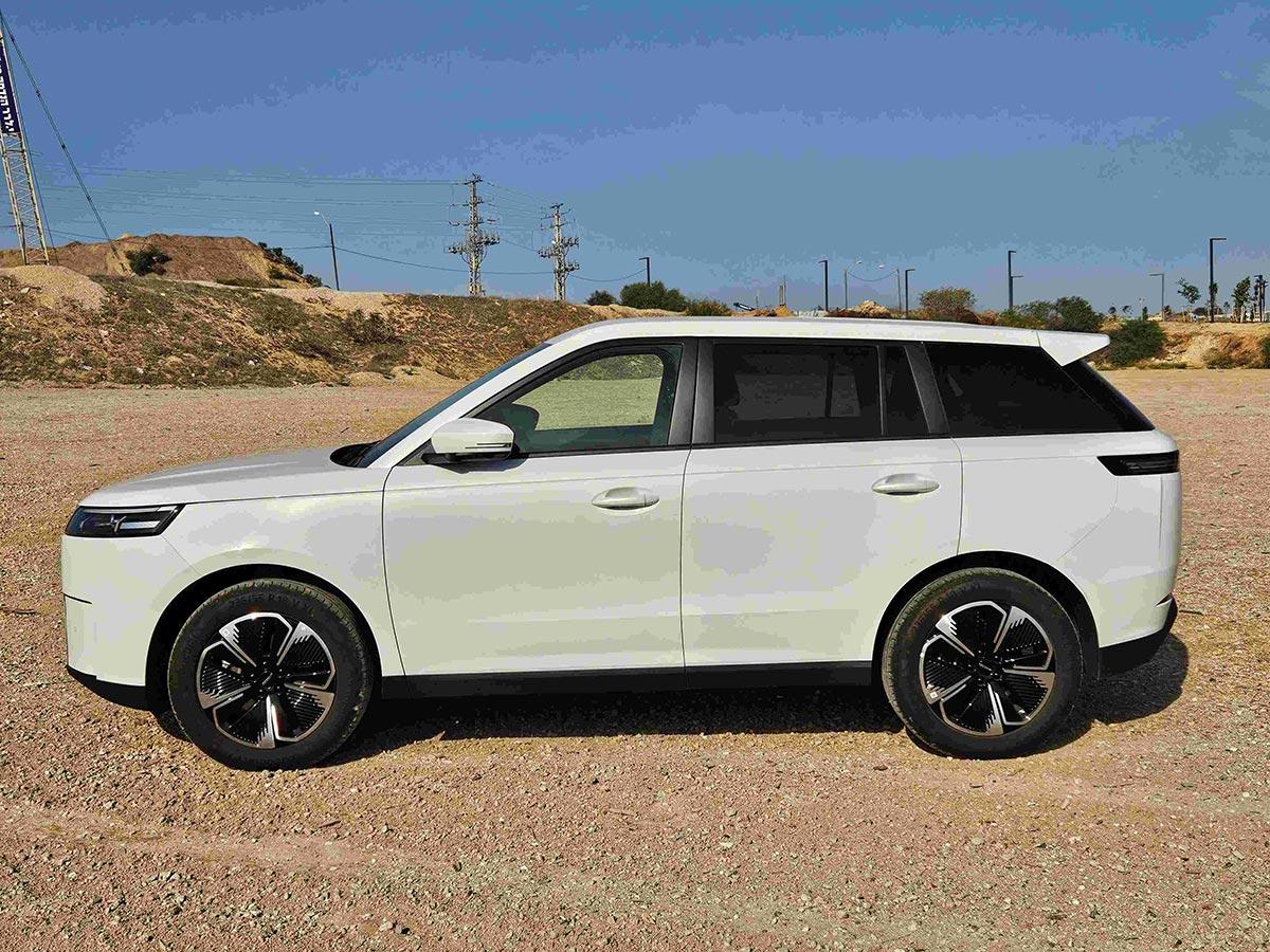 הצד, בקווים ישרים. בגג מסילות אלומיניום, קו זרימה בכתפי הדלתות הרחבות. החלונות כהים מאחור, קשתות גלגלים בולטות וחישוקי אלומיניום מהודרים.