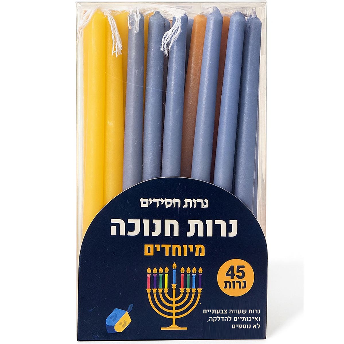 הנרות מגיעים במארז הכולל 45 נרות שעווה איכותיים ועמידים, בצבעים פסטליים נעימים, המיוצרים בתהליך מוקפד המבטיח הדלקה נקייה, יציבה וללא נזילות מיותרות. הנרות מעוצבים בגוונים קלאסיים המזוהים עם חג החנוכה ומשחזרים את חוויית ההדלקה כפי שהייתה בבתים רבים לפני שנים - כשהיינו מדליקים את החנוכייה לצד ההורים והסבים, עם אור חמים וריח שעווה של פעם.