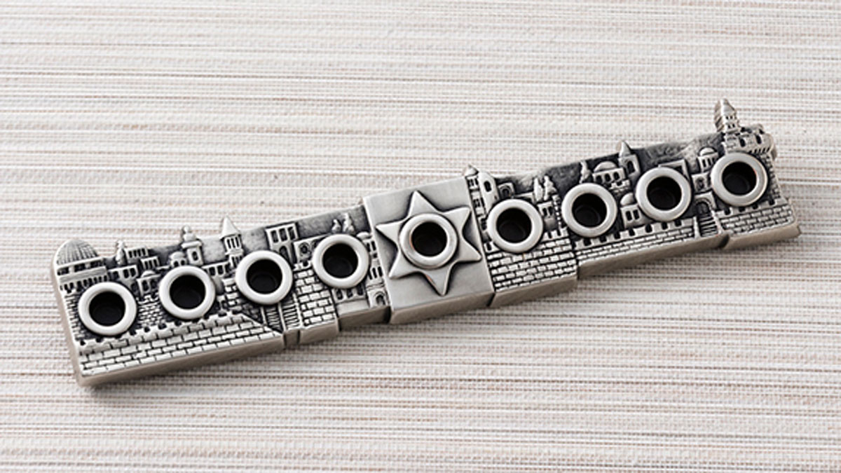 סביבונים יצוקים וחנוכייה עם נופי ירושלים