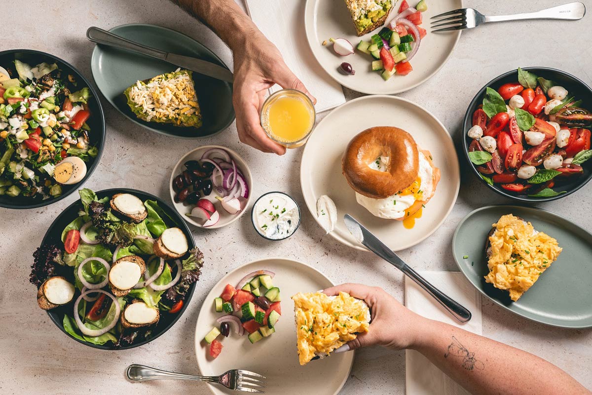 מנות לדוגמה מהתפריט: ברוסקטה עם אבוקדו, בייגל עם סלמון וביצת עין, גריל צ'יז סנדוויץ', שקשוקה, ארוחת בוקר ישראלית.
