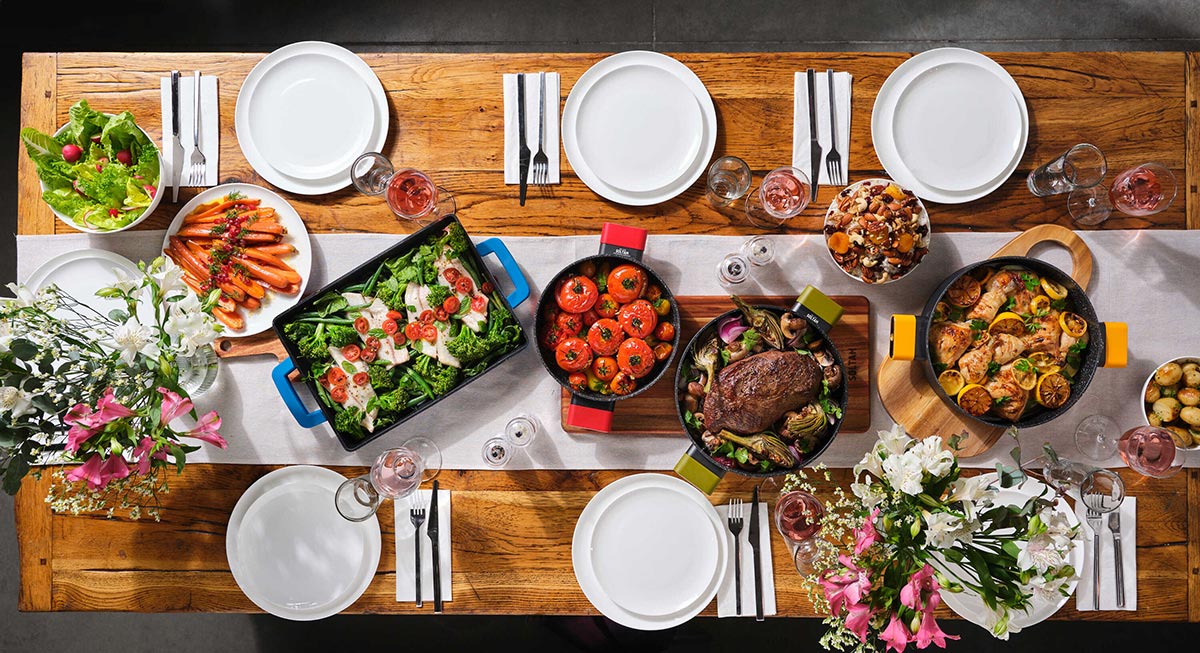 שולחן חג בעיצוב טבעי על פי סולתם עפ"י כלי בישול המוגשים למרכז השולחן. צילום: אנטולי מיכאלי