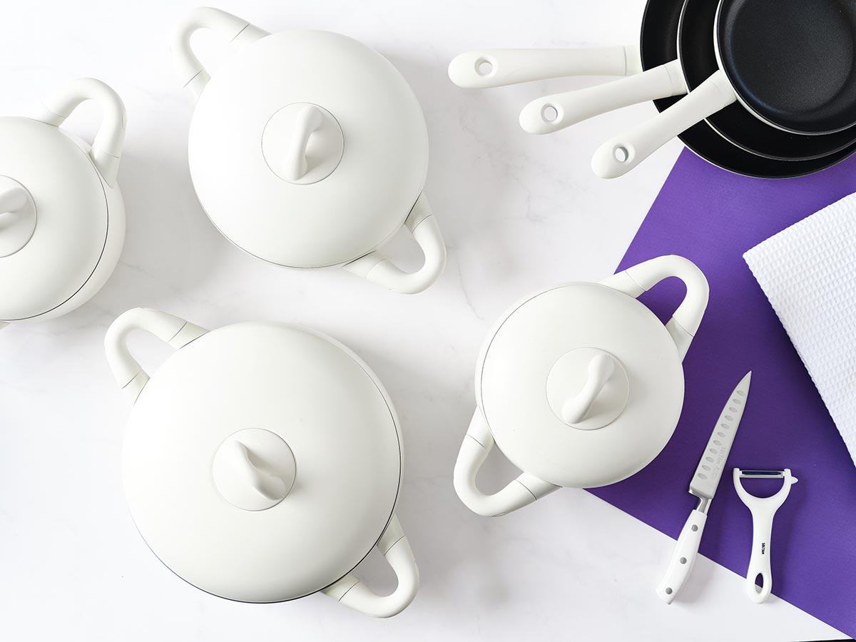 סדרת כלי הבישול TWIST מבית סולתם בצבע לבן- קרמי, 115-400 ש"ח. צילום: אסף אמברם