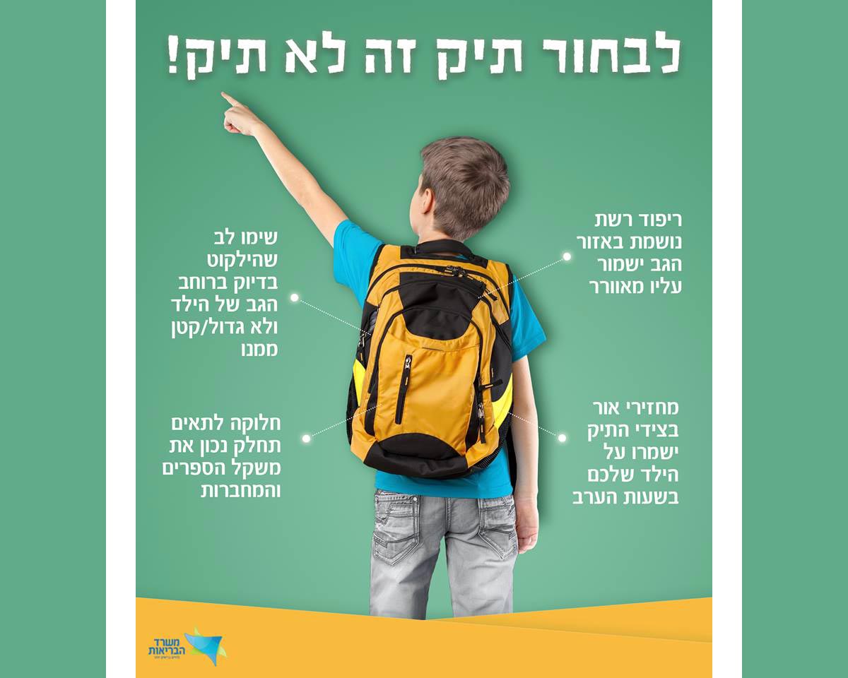 בחירה נכונה של ילקוט גב והתאמתו לממדי הילד חשובה לבריאות הגב. המידע ממשרד הבריאות.