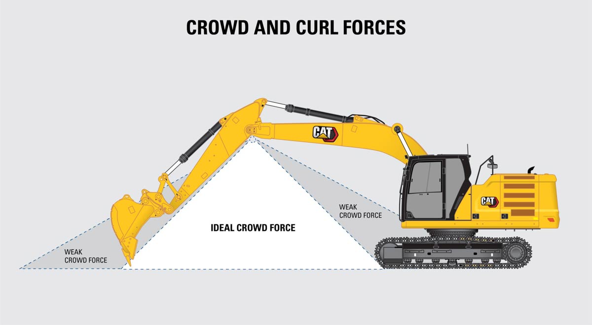 קטרפילר מסבירה כי לשם חפירה יעילה, יש לשלב בין כוח הזרוע הנוצר בעת משיכת הזרוע פנימה לבין כוח הסיבוב של הכף, המופעל באמצעות בוכנת הכף והחיבורים המכניים. לפי החברה, כוח הסיבוב של הכף צריך להיות גבוה ב־10%-15% מכוח המוט כדי להשיג ביצועי חפירה מיטביים ולחסוך בצריכת הדלק. יחס זה מבטיח חדירה טובה לקרקע וטעינת כף מלאה ללא צריכת דלק מיותרת. החברה ממליצה להתייעץ עם נציגי השירות שלה לבחירת כפות ו־bucket tips המתאימים לסוג הקרקע.