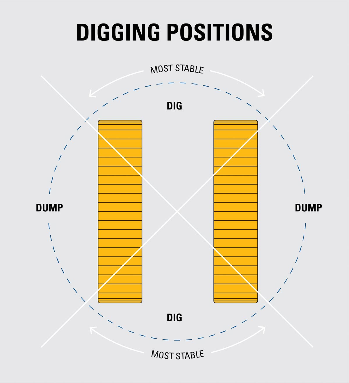 הטווח האפקטיבי של זרוע המחפר נע בין 35 ל־45 מעלות ביחס לקו האנכי ועד חזרה למצב אנכי. חפירה מחוץ לטווח זה מאריכה את מחזורי העבודה ומפחיתה את היציבות. הכף צריכה להתמלא עד שהמוט חוזר למצב אנכי, והמפעיל נדרש להזיז את הכלי קדימה או אחורה בין מעברים כדי לשמור על הזווית הזו.