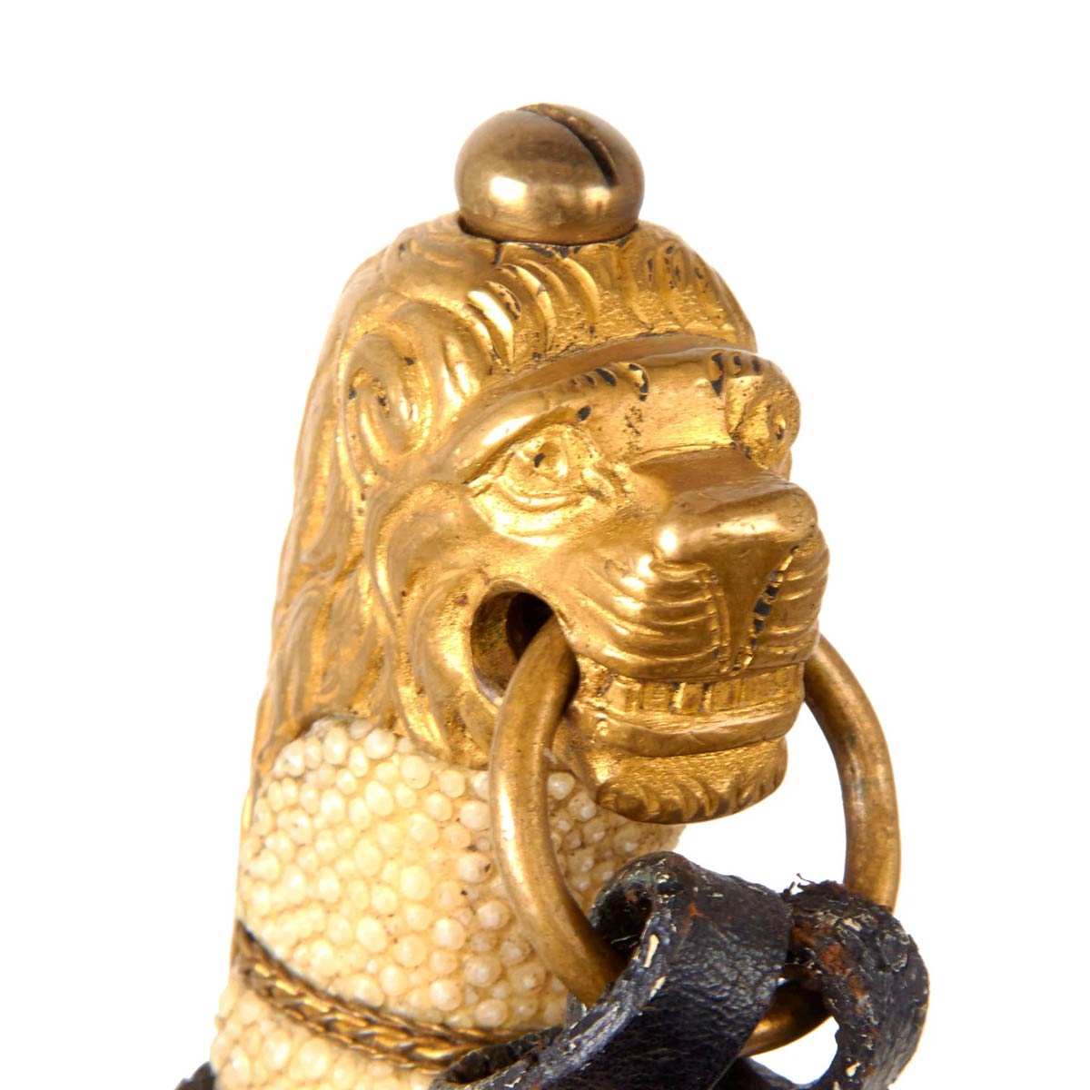 ידית האחיזה מרהיבה לא פחות: היא עשויה מעור שזור בחוט מתכת עדין וחתומה בראש אריה מוזהב - סמל מסורתי לכוח ולאצילות. לטבעת האחיזה מחובר חוט עור טקסי מקורי, ככל הנראה זה ששימש את קציני האקדמיה במשך ההכשרה. אמנם מצב העור כיום שחוק והוא קרוע במספר מקומות, אך נשמרו מרבית המאפיינים המקוריים. המגן הקדמי עשיר בעיטורי בלוטים המסמלים עמידות ופריון, ועל גבו מוטבע המספר 83 - ייתכן שזה מספר סדרה או מספר אישי של קצין. הנדן המקורי עשוי מעור איכותי ובעל חיזוקי מתכת, והוא שמור וטוב יחסית. מנגנון הנעילה שלו עדיין פעיל, והחרב משתלבת בו באופן מושלם.
