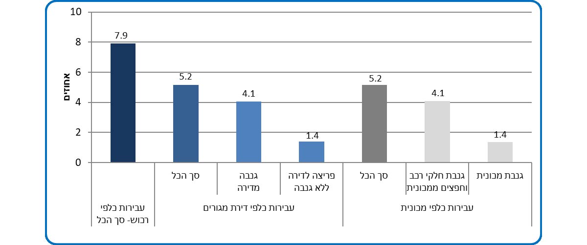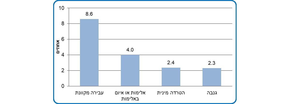 *אחוז ממשקי הבית בקבוצות הגיל הרלוונטיות לכל סוג עבירה; נתון בעבור היפגעות מעבירות מין אינו מוצג עקב מיעוט מקרים וטעות דגימה יחסית הגבוהה מ-30%.