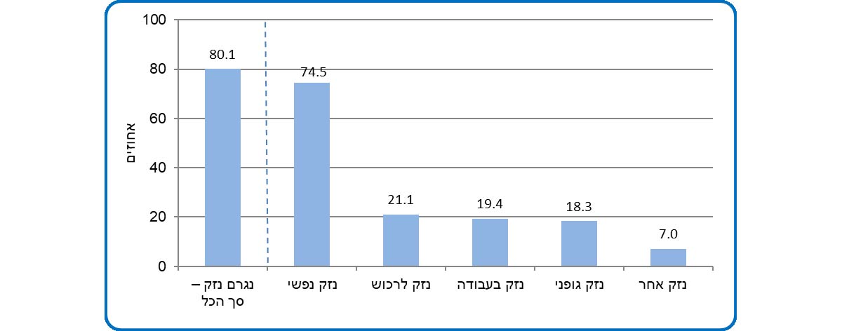 נפגעי עבירת אלימות או איום באלימות, לפי סוג הנזק שנגרם: מתוך כ-252 אלף נפגעי עבירות אלימות או איום באלימות, 201.5 אלף (80.1%) השיבו שנגרם להם נזק (ייתכנו כמה סוגי נזק, לכן סכום כל סוגי הנזק גדול מ-100%). מתוכם אחוז המדווחים על נזק נפשי היה השכיח ביותר בפער ניכר (74.5%).