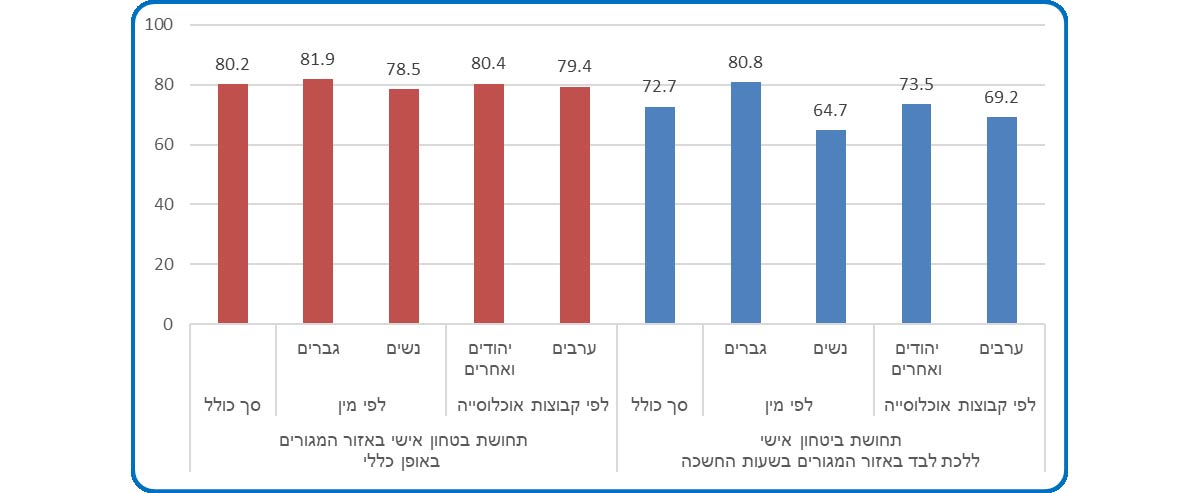 תחושת ביטחון אישי באזור המגורים והליכה לבד באזור המגורים בשעות החשכה: 80.2% ציינו שהם חשים בטוחים 'במידה רבה מאוד' או 'במידה רבה' באופן כללי באזור המגורים. בתחושת הביטחון האישי באופן כללי באזור המגורים, שיעורי הגברים והנשים היו דומים (81.9% לעומת 78.5%, בהתאמה). 72.7% ציינו שהם חשים בטוחים 'במידה רבה מאוד' או 'במידה רבה' ללכת לבד באזור המגורים בשעות החשכה - גברים יותר מנשים (80.8% לעומת 64.7%, בהתאמה). בתחושת הביטחון האישי באופן כללי באזור המגורים ובאשר להליכה לבד בשעות החשכה, שיעור החשים בטוחים 'במידה רבה מאוד' או 'במידה רבה' בקרב יהודים ואחרים ובקרב הערבים היה דומה.