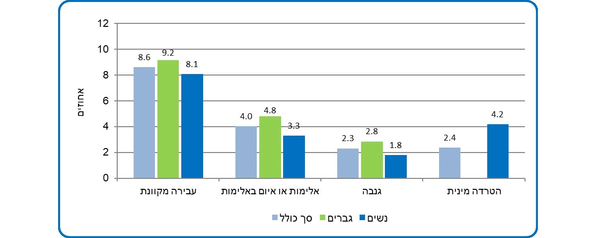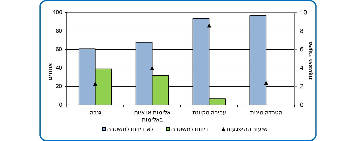 *נתון על היפגעות מעבירות מין אינו מוצג עקב מיעוט מקרים וטעות דגימה יחסית הגבוהה מ-30%