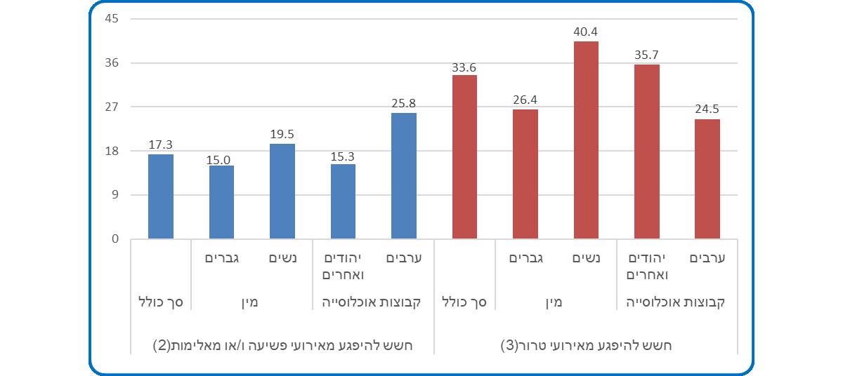 33.6% ציינו שהם חוששים 'במידה רבה מאוד' או 'במידה רבה' להיפגע מאירועי טרור באזור המגורים. באשר לחשש להיפגע מאירועי טרור באזור המגורים לפי מין, נמצא פער גדול בין נשים לגברים (40.4% לעומת 26.4%, בהתאמה). יהודים ואחרים חוששים להיפגע מאירועי טרור יותר מערבים (35.7% לעומת 24.5%, בהתאמה).