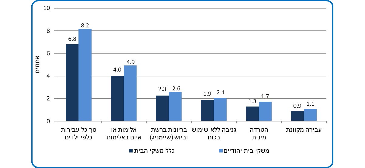 *משק בית עשוי להיפגע מכמה סוגי עבירות, לכן סך משקי הבית שנפגעו מכל סוגי העבירות גדול מהסך הכול.
