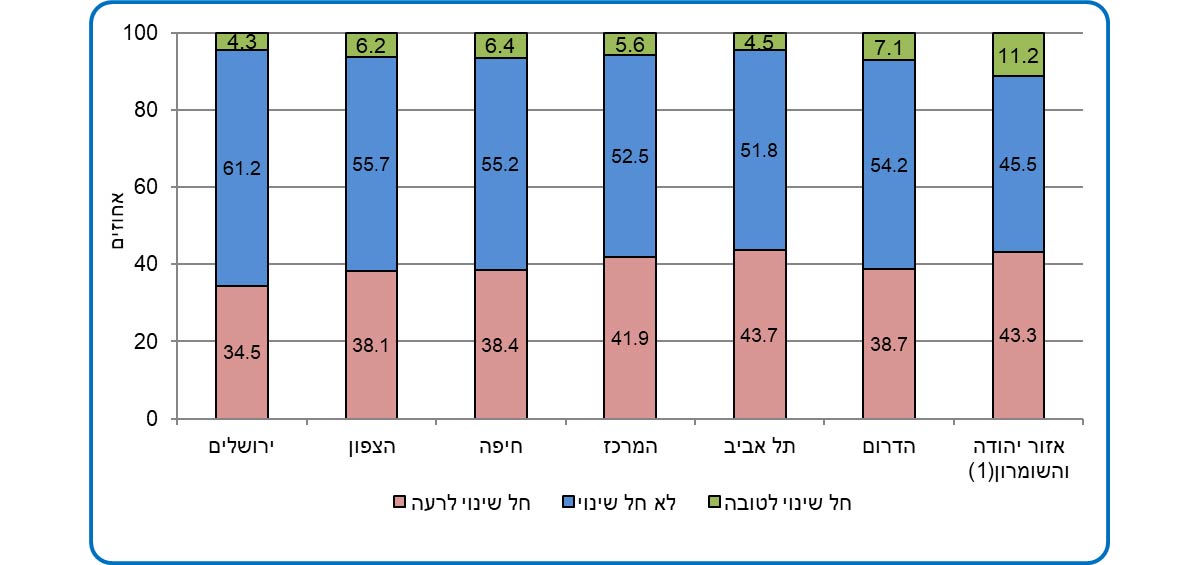 בכל המחוזות שיעור המדווחים על שינוי לרעה גבוה מהמדווחים על שינוי לטובה. במחוז תל אביב (43.7%) ובאזור יהודה ושומרון (43.3%) נמצאו השיעורים הגבוהים ביותר של המדווחים על שינוי לרעה, ואילו במחוז ירושלים נמצא השיעור הנמוך ביותר (34.5%).