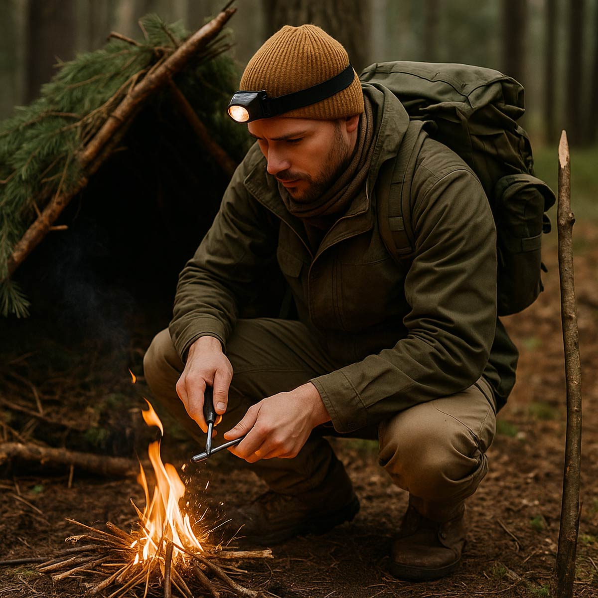 כעת, כשיש לכם מים ומחסה, הגיע הזמן להדליק אש. אש תספק חום, תאפשר לבשל ותהווה גם אמצעי לאותת לעזרה. להלן דרך בסיסית להדליק מדורת מחנה באמצעות אמצעים פשוטים שאמורים להיות ברשותכם בשטח. ראשית יש לאסוף זרדים דקים ויבשים וליצור "קן" של חלקיקי עץ - למשל מחטי אורן, עלים או כל חומר צמחי יבש אחר שתצליחו למצוא. בשלב הראשון של הדלקת האש, ככל שהחומר דק ועדין יותר כך יקל על ההבערה. ניתן להוסיף ענפים עבים יותר כשהאש כבר יציבה וחמה. לאחר שאספתם עצים וצמחייה בכמות מספקת, אפשר להצית את האש. כדאי לתרגל מראש כמה שיטות שונות ולהחזיק אותן כחלק קבוע מהציוד שלך. מצית או גפרורים היא הדרך הפשוטה וה"מוכרת" ביותר. העיקר הוא לשמור עליהם יבשים, למשל בתיבה אטומה למים, תמיד בתרמיל כגיבוי.
