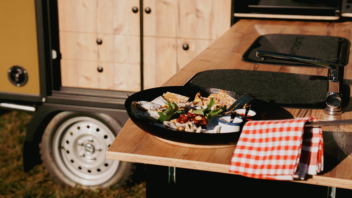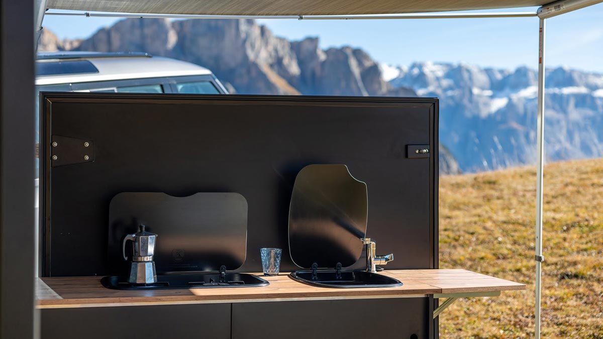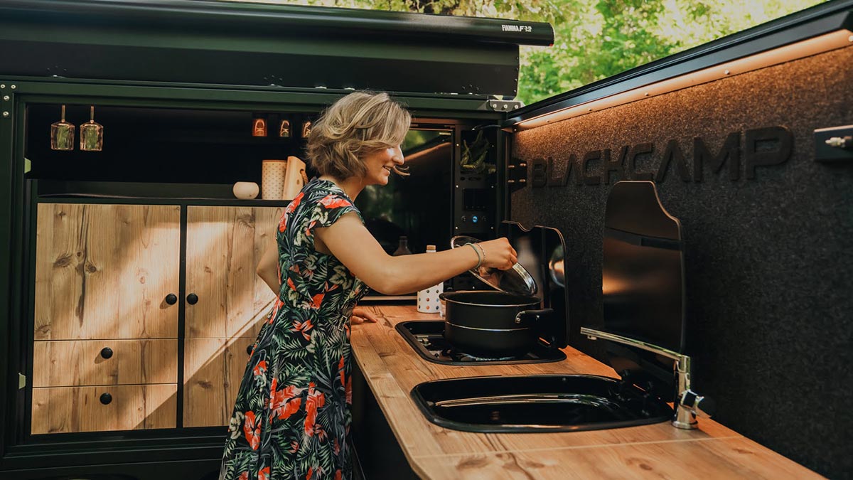 המטבח, המשולב מאחורי אחת מדלתות הצד הגדולות, כולל כיריים גז עם שני מבערים, כיור, משטח עבודה מעץ ומקרר בנפח 63 ליטר, הנתמכים על ידי מגירות ותאי אחסון לכלי מטבח ומצרכים. מכל מים נקיים בנפח 60 ליטר ומכל מים אפורים בנפח 20 ליטר מספקים קיבולת מספקת לטיולים קצרים עד בינוניים ללא תלות בתשתיות חיצוניות.