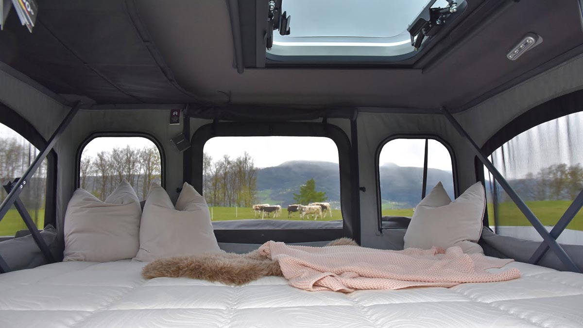 פתרונות הלינה מסופקים באמצעות אוהל גג אופציונלי המובנה בתוך הגרור. בעת הפריסה, האוהל מתרחב כלפי מעלה כדי ליצור אזור שינה לעד ארבעה אנשים, מה שמפריד את חלל המנוחה מאזורי האחסון והפעילות היומית. חלונות גדולים המשולבים בבד האוהל משפרים את האוורור והראות. התכונה נעשית שימושית בייחוד באקלים חם או בשהיות ממושכות. על ידי שמירה על אזור השינה מוגבה ומודולרי, בלאק קמפ נמנעת מהפשרות המקושרות לעיתים קרובות למיטות פנימיות קבועות בגרורים קטנים.