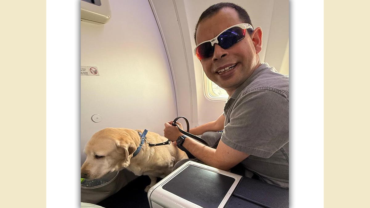 א' ד', נוסע עם Terminal4Pets, עם כלב הנחייה שלו, מריוס, בטיסה בינלאומית