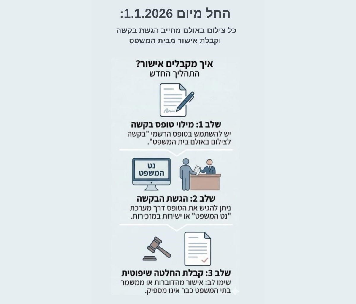 כפי האמור במכתב, עם כניסת התיקון לחוק לתוקף ביום 1.1.26 חלים מספר שינויים לגבי צילומים בבתי המשפט: