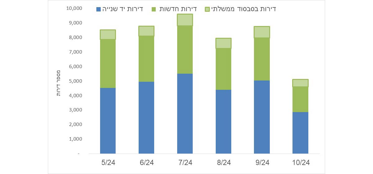 בחודש אוקטובר 2024 נמכרו 5,110 דירות, עלייה של 93.9% בהשוואה לאוקטובר 2023 שבו פרצה מלחמת חרבות ברזל. בהשוואה לחודש הקודם (ספטמבר 2024) נרשמה ירידה של 41.7%, ובניכוי עונתיות נרשמה ירידה מתונה יותר של 14.6%.