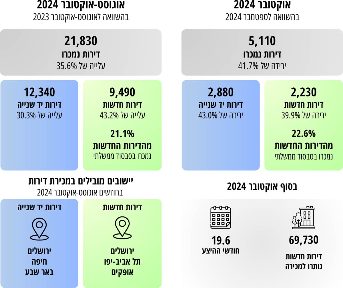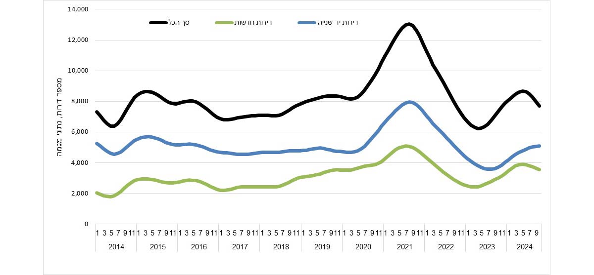 בשלושת החודשים אוגוסט-אוקטובר 2024 נמכרו כ-21,830 דירות, עלייה של 35.6% בהשוואה לתקופה המקבילה אשתקד (אוגוסט-אוקטובר 2023) וירידה של 18.9% בהשוואה לשלושת החודשים הקודמים, מאי-יולי 2024.