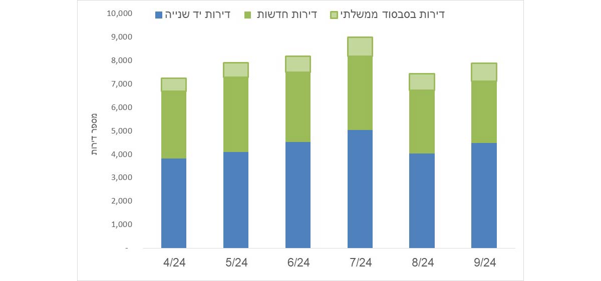 בחודש ספטמבר 2024 נמכרו 7,900 דירות, עלייה של 45.6% בהשוואה לספטמבר 2023, ובניכוי עונתיות עלייה מתונה יותר של 25.0%. בהשוואה לחודש הקודם (אוגוסט 2024) נרשמה עלייה של 6.0%, ובניכוי עונתיות נרשמה מגמה הפוכה - ירידה של 2.3%.