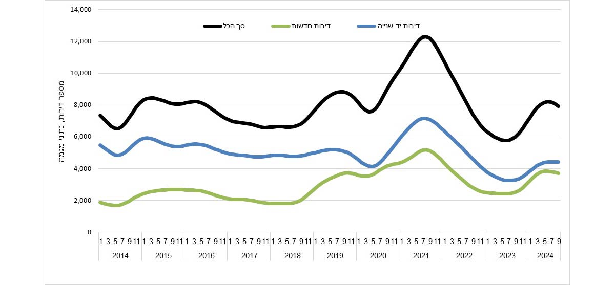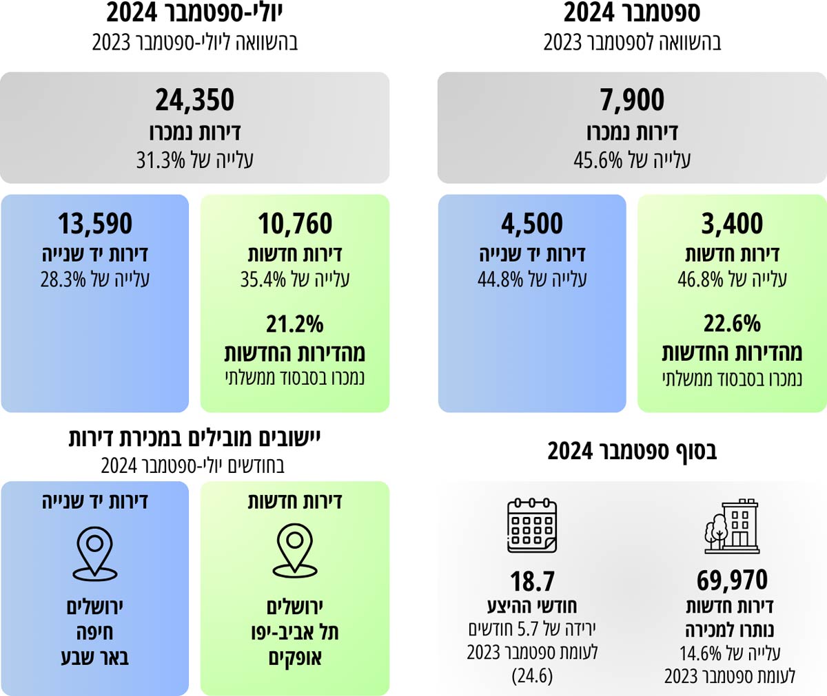 בשלושת החודשים יולי-ספטמבר 2024 נמכרו כ-24,350 דירות, עלייה של 31.3% בהשוואה לתקופה המקבילה אשתקד (יולי-ספטמבר 2023) ועלייה של 4.3% בהשוואה לשלושת החודשים הקודמים, אפריל-יוני 2024.