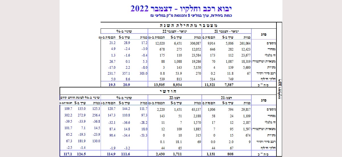 בחודש דצמבר 2022 נרשם יבוא כלי רכב פרטיים בהיקף של 63,137 לעומת 29,817 כלי רכב בדצמבר 2021 - עלייה בשיעור של 111.7%. יבוא רכב מסחרי הסתכם ב-2,188 כלי רכב לעומת 1,109 כלי רכב בדצמבר 2021 - עלייה של 97.3%.