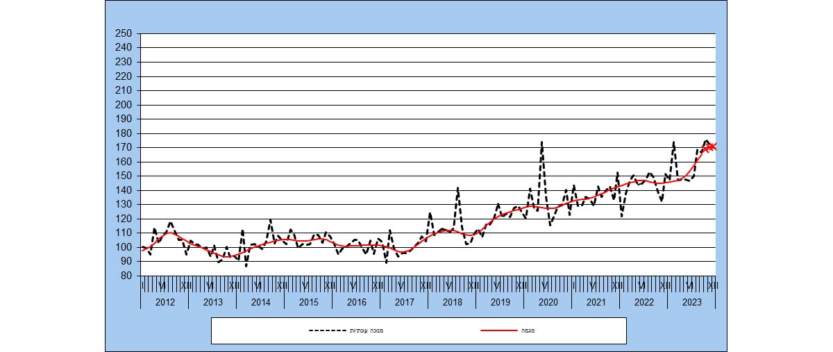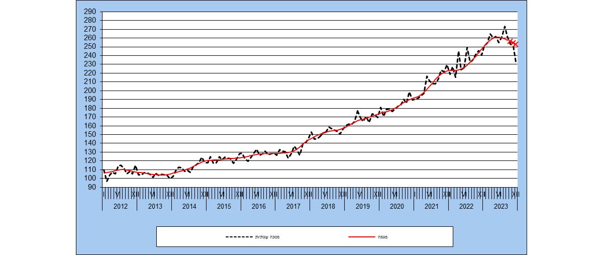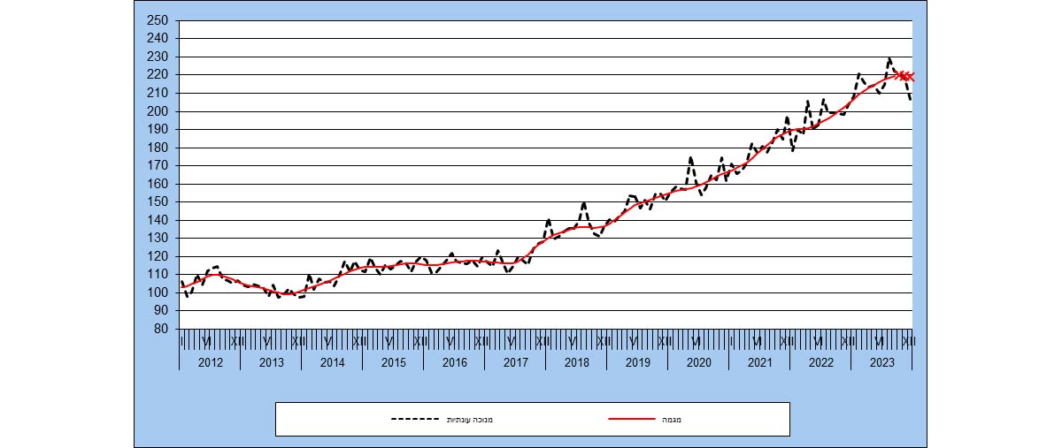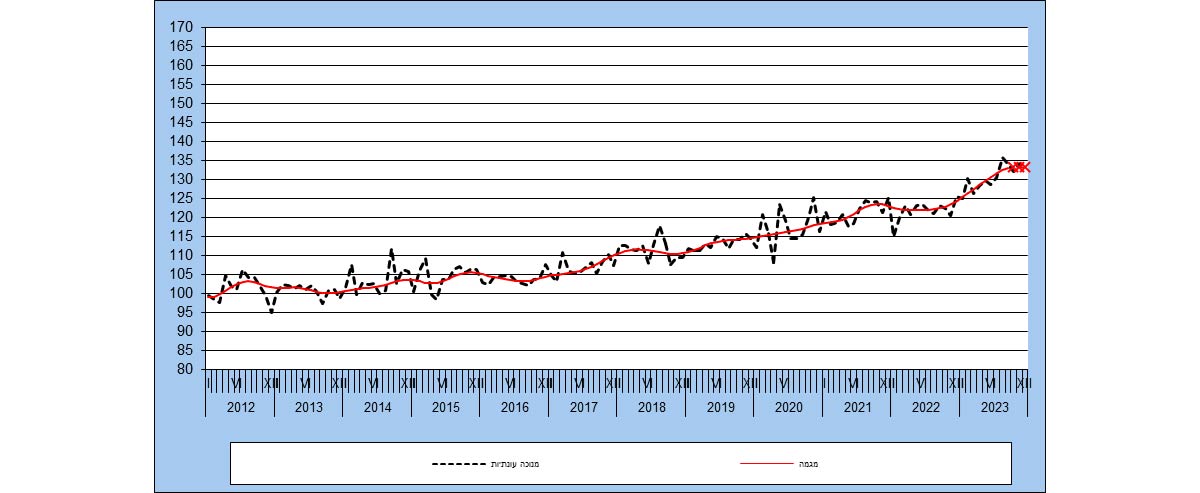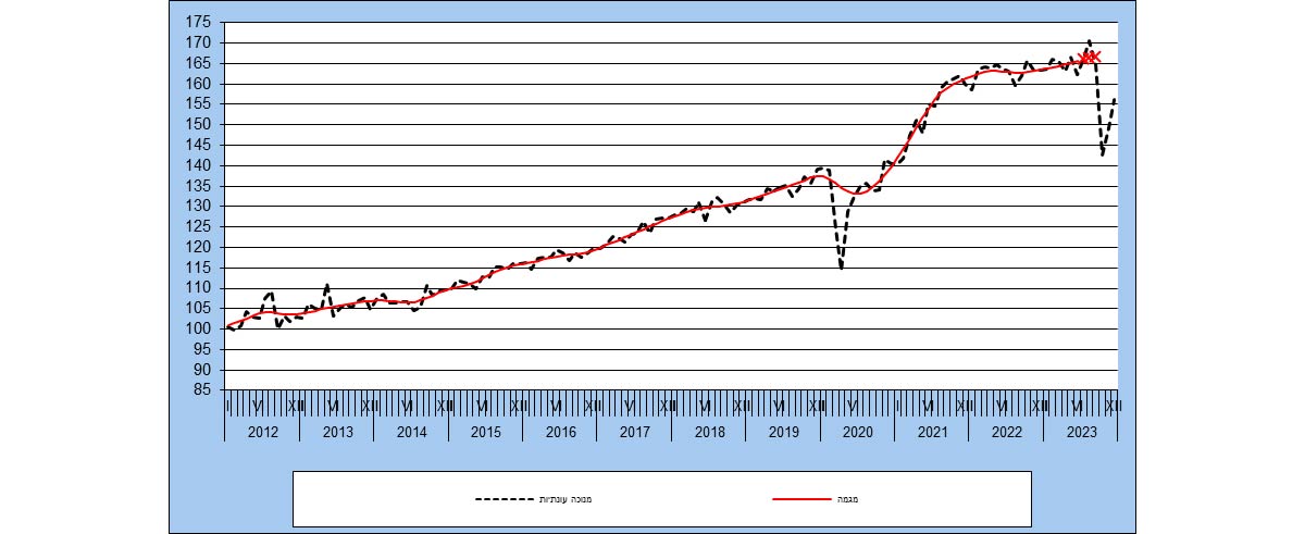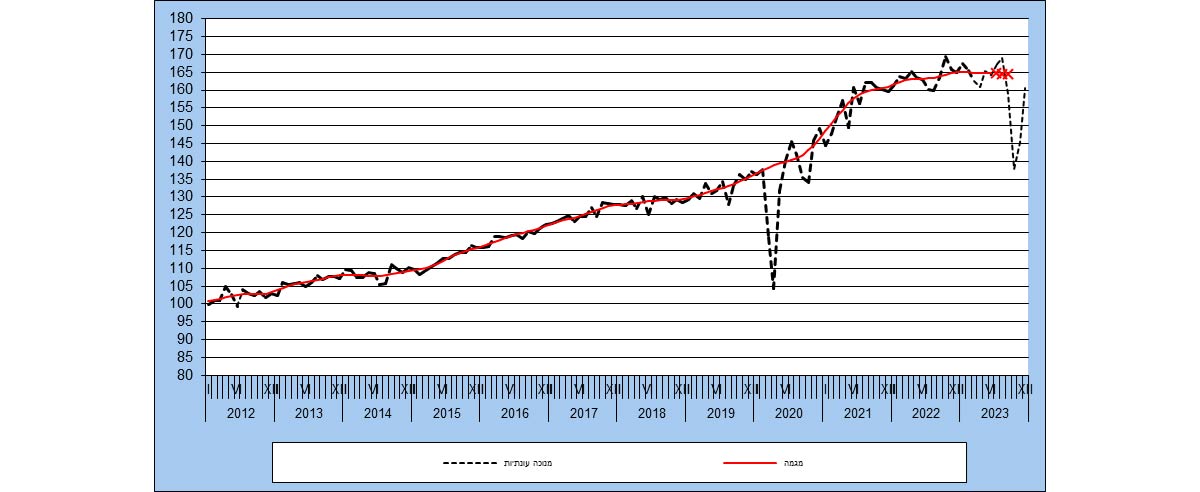 הערות: עקב מלחמת "חרבות ברזל" לא התאפשר לחשב נתוני מגמה לחודשים אוקטובר-דצמבר 2023 לסדרות האלו: חקלאות (ענף סדר A), ענפי הבינוי (ענף סדרF ), מסחר סיטוני וקמעוני (ענף סדר G), תחבורה (ענף סדר H), שירותי אוכל והארחה (ענף סדר I), שירותים מקצועיים מדעיים וטכניים (ענף סדר M), שירותי ניהול ותמיכה (ענף סדר N), חינוך (ענף סדר P), שירותי בידור ופנאי (ענף סדר R) ושירותים אישיים (ענף סדר S). מכאן שגם אין אומדני מגמה לסך ענפי הכלכלה. בחודשים הבאים, בהתאם לנתונים שיתקבלו, ייבחן פרסום של אומדני המגמה בענפים אלו.