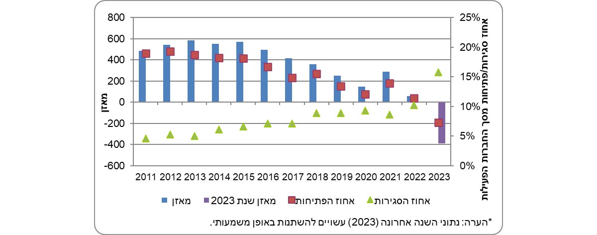 תרשים 2 - מאזן, פתיחות וסגירות של חברות הזנק והאחוז שלהן מסך החברות הפעילות, 2023-2011