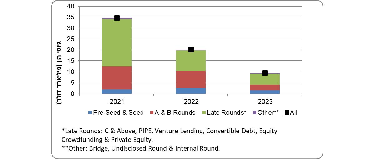 בשנת 2023 גייסו חברות הזנק וחברות בשלות 9.5 מיליארד דולר. זו ירידה של 53% לעומת שנת 2022 שבה גויסו 20.2 מיליארד דולר, בהמשך לירידה של 42% בשנת 2022 לעומת שנת 2021 שבה גויסו 34.7 מיליארד דולר. בכל סוגי הגיוס התקיימו ירידות, בפרט בסוג הגיוס A & B Rounds (הנוגע לשלבי הפיתוח הראשונים של החברות המגייסות) שבו חלה ירידה של 67% לעומת שנת 2022.