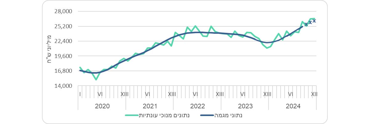 נתוני המגמה ונתונים מנוכי עונתיות מתקבלים לאחר ניכוי השפעת העונתיות והשפעת חגים וימי פעילות מהנתונים המקוריים. נתוני המגמה נאמדים לאחר הסרת השפעת האי סדירות (רעשים) מהנתונים מנוכי עונתיות. הנתונים מנוכי עונתיות ונתוני מגמה המתפרסמים עשויים להתעדכן כאשר מתקבלים נתונים מקוריים חדשים.