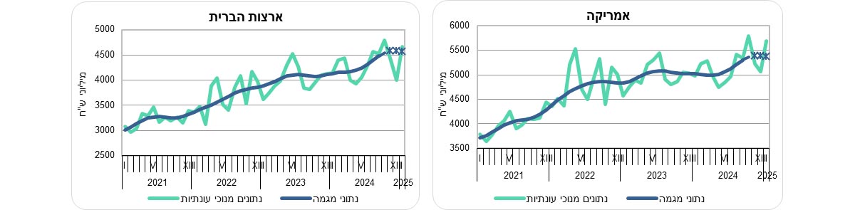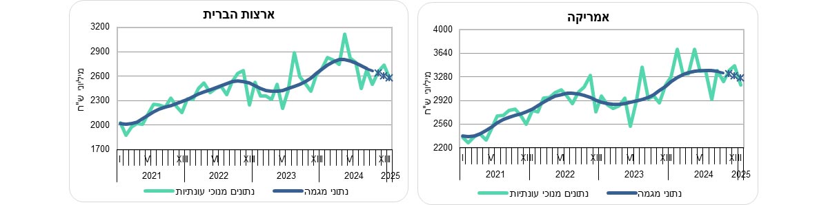 יצוא הסחורות לאמריקה עלה בשלושת החודשים האחרונים ב-1.1% בחישוב שנתי, בהמשך לעלייה של 19.2% בחודשים אוגוסט עד אוקטובר 2024. יצוא הסחורות לארצות הברית עלה בשלושת החודשים האחרונים ב-2.7% בחישוב שנתי, בהמשך לעלייה של 22.8% בחודשים אוגוסט עד אוקטובר 2024 (עלייה של 1.7% בממוצע לחודש).