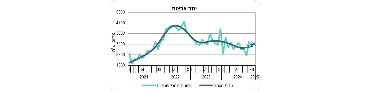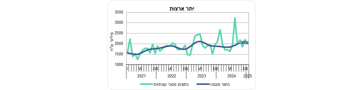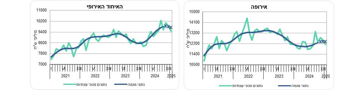 על פי נתוני המגמה, בחודשים נובמבר 2024 עד ינואר 2025 עלה יצוא הסחורות (למעט אוניות, מטוסים ויהלומים) ב-1.4% בחישוב שנתי, בהמשך לעלייה של 7.0% בחישוב שנתי בחודשים אוגוסט עד אוקטובר 2024. יצוא הסחורות לאירופה עלה בחודשים נובמבר 2024 עד ינואר 2025 ב-0.7% בחישוב שנתי. זאת לאחר ירידה של 2.1% בחודשים אוגוסט עד אוקטובר 2024.