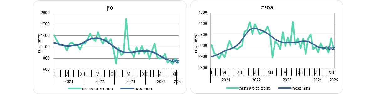 יצוא הסחורות לארצות אסיה ירד ב-3.2% בחישוב שנתי בחודשים נובמבר 2024 עד ינואר 2025, בהמשך לירידה של 4.6% בחודשים אוגוסט עד אוקטובר 2024. יצוא הסחורות לסין ירד ב-12.3% בחישוב שנתי בחודשים נובמבר 2024 עד ינואר 2025, בהמשך לירידה של 36.2% בחודשים אוגוסט עד אוקטובר 2024 (ירידה של 3.7% בממוצע לחודש).