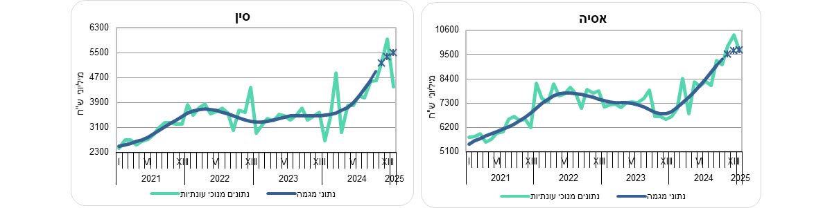 על פי נתוני המגמה, בשלושת החודשים האחרונים עלה יבוא הסחורות מארצות אסיה ב-18.5% בחישוב שנתי, בהמשך לעלייה של 51.5% בחישוב שנתי בחודשים אוגוסט עד אוקטובר 2024 (עלייה של 3.5% בממוצע לחודש). יבוא הסחורות מסין עלה ב-58.7% בחישוב שנתי (עלייה של 3.8% בממוצע לחודש), בהמשך לעלייה של 105.3% בחודשים אוגוסט עד אוקטובר 2024 (עלייה של 6.2% בממוצע לחודש).